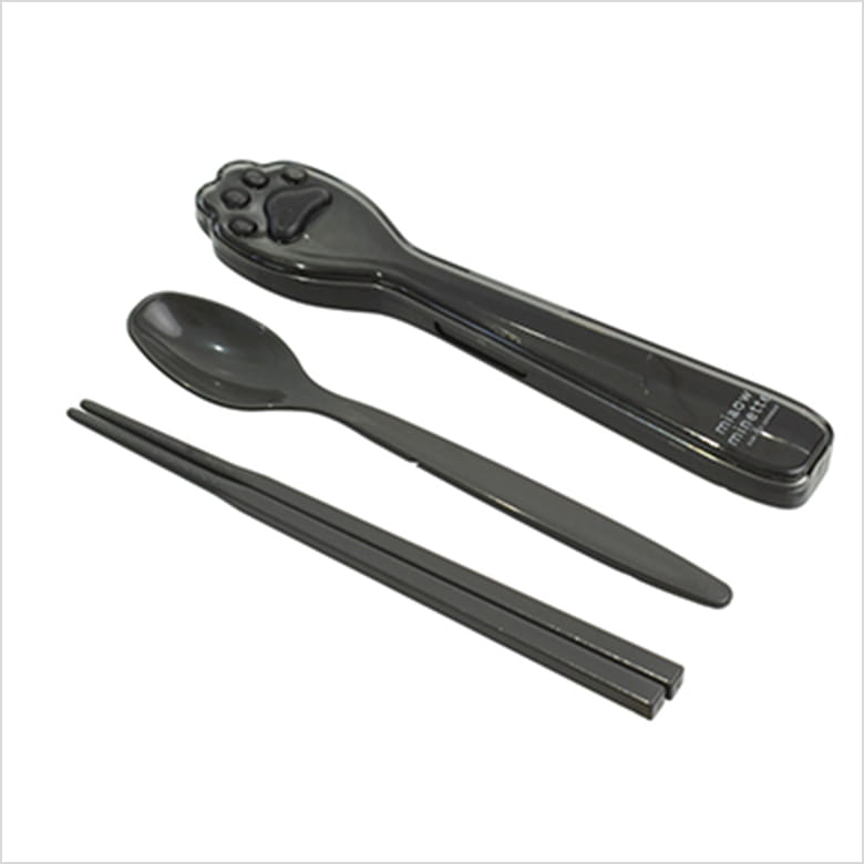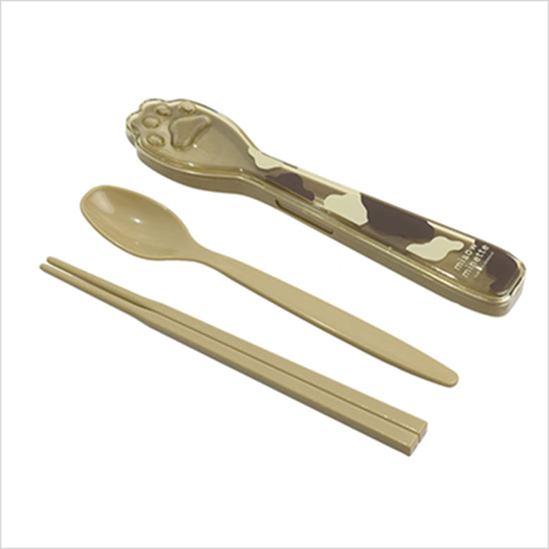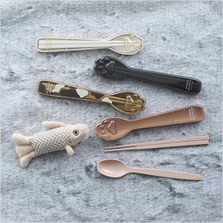 箸、スプーン、ケースのセット。ケースの丸い部分には肉球をイメージした凹凸があり、パンなどに足あとをつけられる。全パーツ食洗機OK。