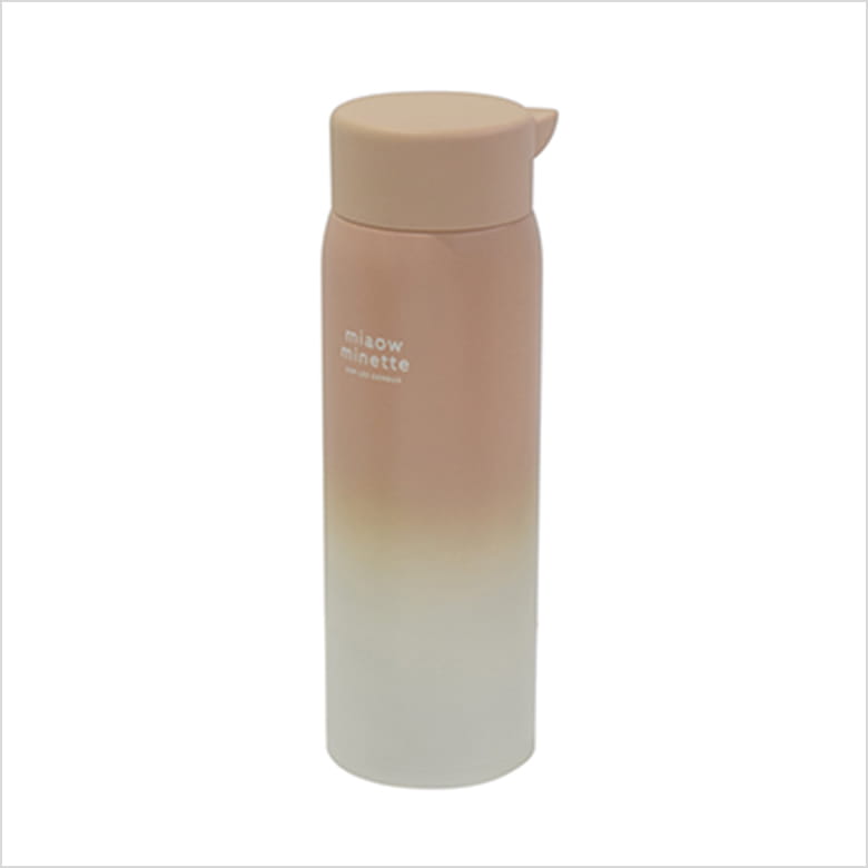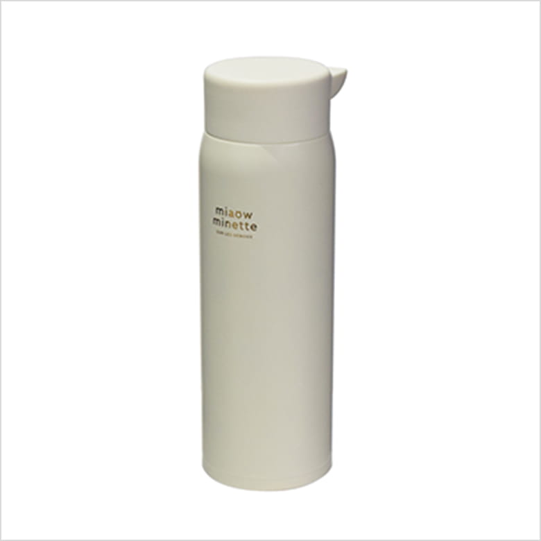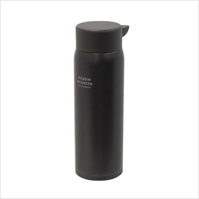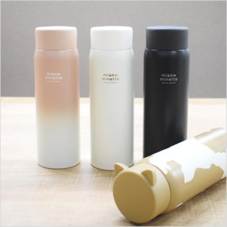 カラーごとに違ったデザインのステンレス製ボトル。フタにはかわいいねこみみが付いていて、開ける時に力が入りやすい。飲み口付き。食洗機NG。