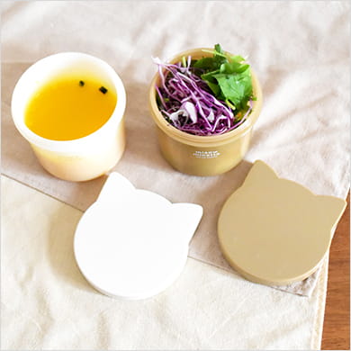スープやサラダ、夏にはつけめんのたれなどにちょうどいいコンテナ。フタにはかわいいねこみみが付いていて、開けるときに力が入りやすい。冷凍対応。フタ以外レンジOK。フタ以外食洗機OK。