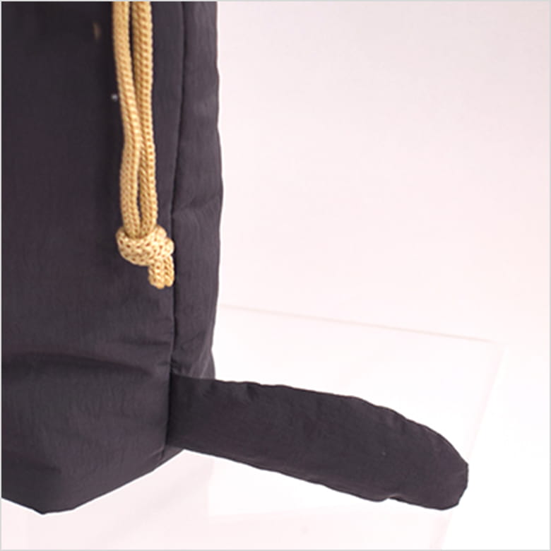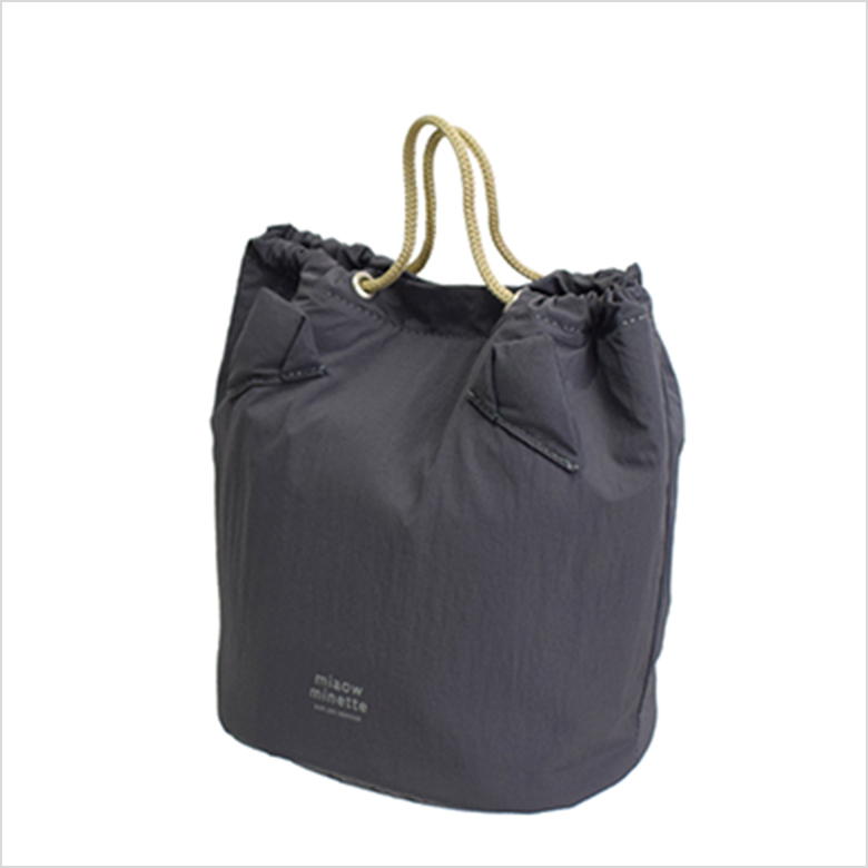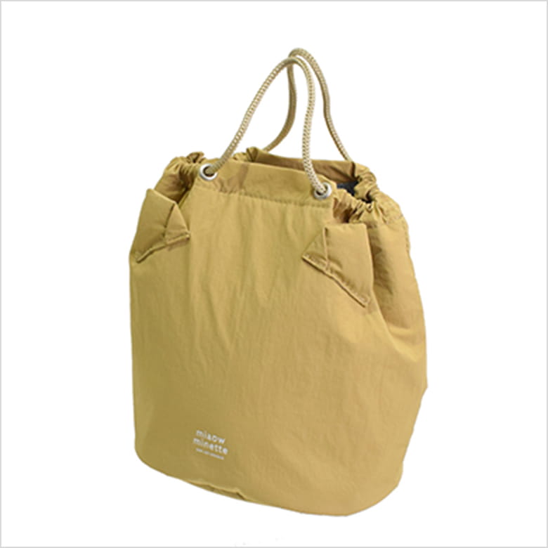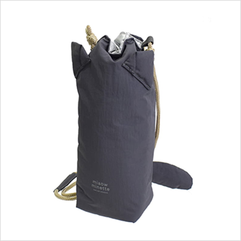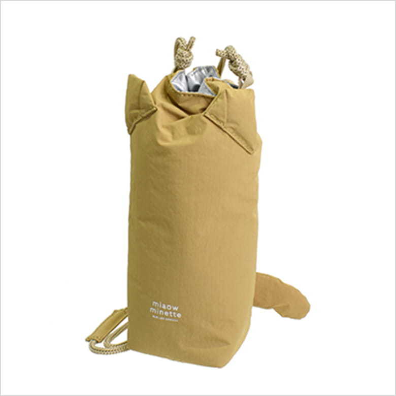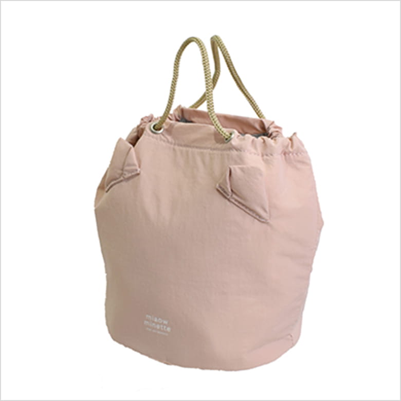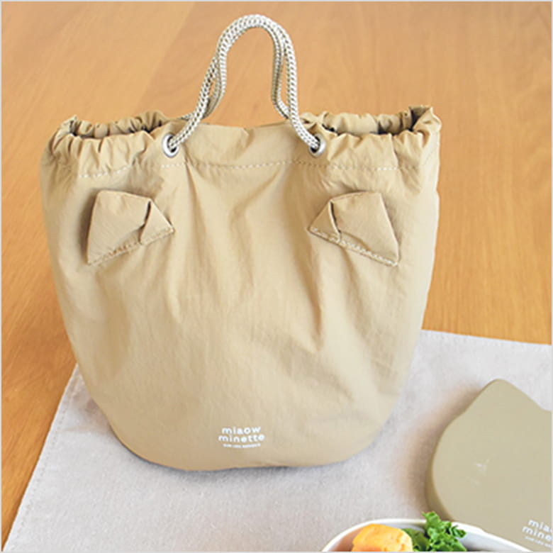 ふわっとしたねこみみが付いたハンドル付きの保冷ポーチ。表生地はやわらかくて軽いナイロン素材。内側は耐水性、耐久性に優れたPEVA。